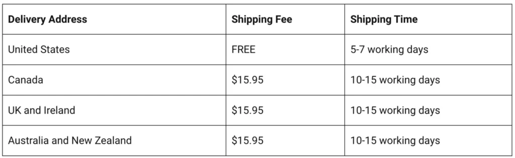 Orders are processed within 2–3 business days. Typical delivery is 5–7 days in the US and 10–12 days internationally (customs may affect timing). You’ll receive a tracking email within about 60 hours of purchase.